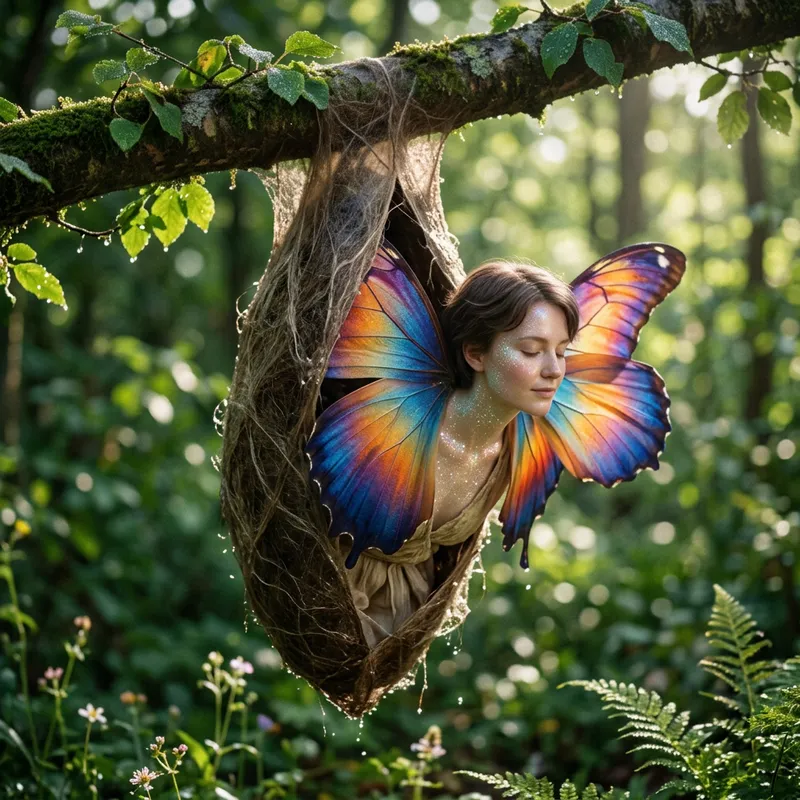 Imagine a surreal scene where a humanoid with colourful butterfly wings is emerging from a cocoon. It shows the transformation of a cocoon hanging on the branch of a tree. The cocoon has started to split open, revealing a human-like being inside. This individual with Caucasian descent and gender-neutral characteristics, glistens in the soft sunlight. Their skin is sparkling like dew on new leaves and magnificent rainbow-coloured butterfly wings are unfurling from their back. The metamorphosis is almost complete, giving a beautiful fusion of human and butterfly world.