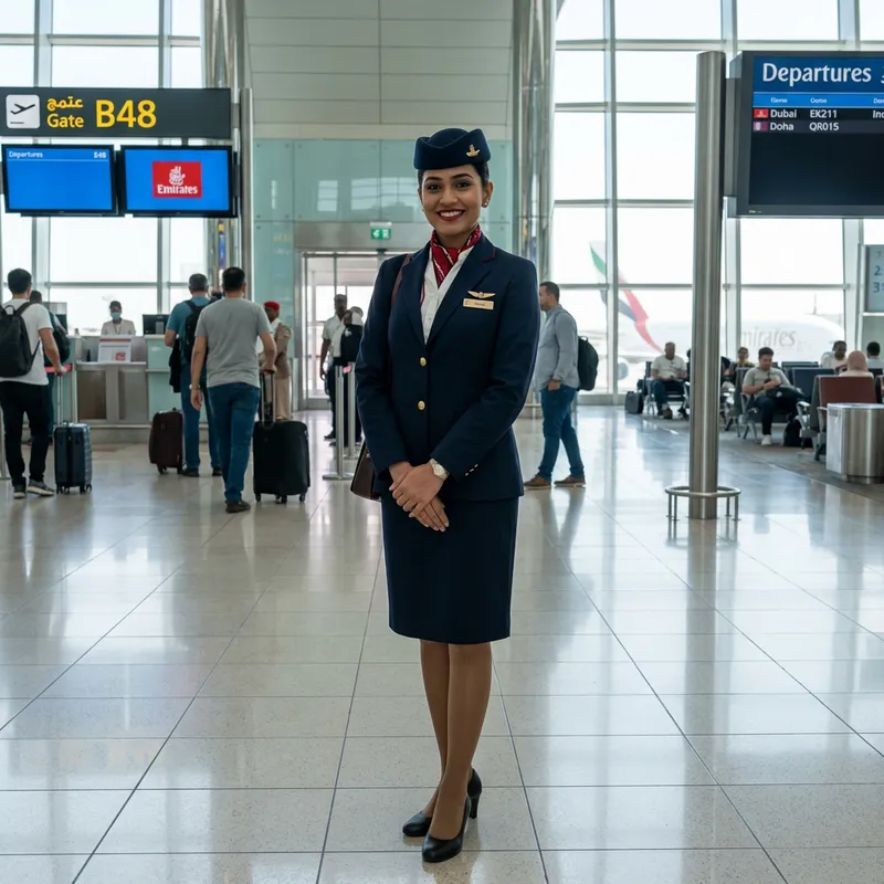 cabin crew photo, person wearing flight attendant blazer with hat, airport terminal background, poised standing posture, friendly service expression, bright terminal lighting.