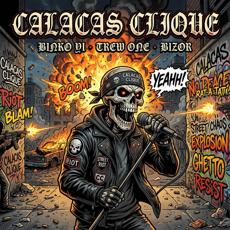Skull with microphone, street background, graffiti, gunshots, and explosion, name of the group Calacas Clique in Old English font, names of artists: Binko Yi, Trew One, Bizor, comic style.