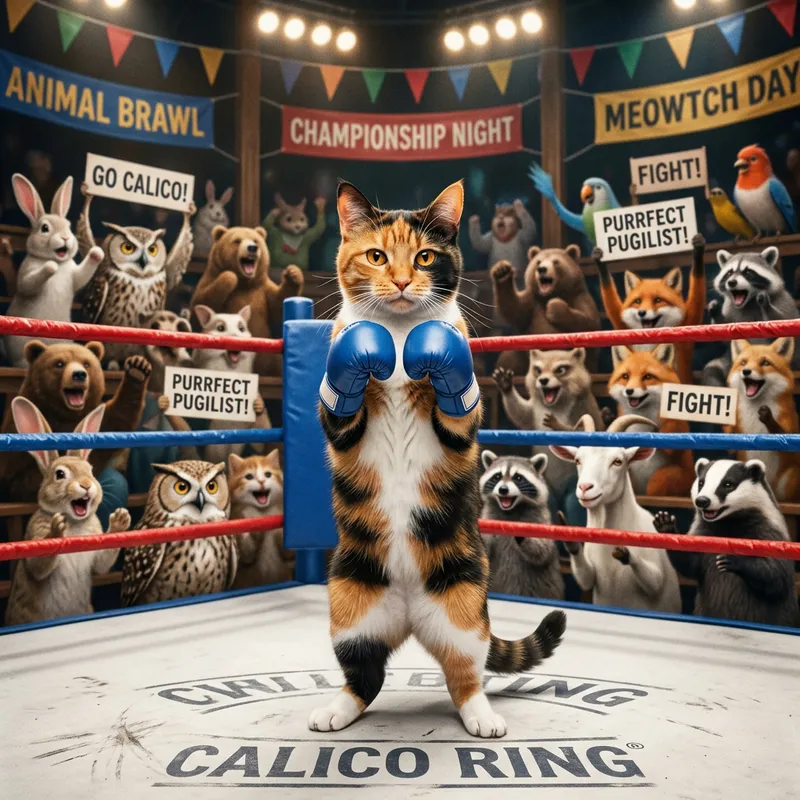A detailed scene of a domestic short-haired cat, with a beautiful calico pattern, in a boxing ring. The cat is adorned with miniature blue boxing gloves on its paws, standing upright on its hind legs ready for a friendly boxing match. The boxing ring has red ropes and a white canvas. In the background, there is a cheering crowd of various animals from different species, they are adding a touch of whimsy to the atmosphere.