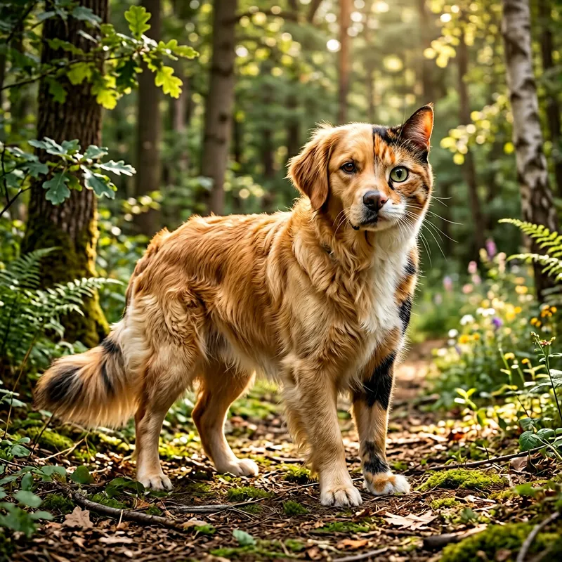 A fascinating scene with a mythical creature that's a hybrid of two animals we typically see as pets. The creature's right side is a domestic short-haired calico cat with expressive green eyes and soft, multi-colored fur. The cat side has an air of curiosity typical of felines. The creature's left side is a medium-sized golden retriever dog with warm, intelligent brown eyes and a lusciously thick golden coat. The dog side gives off an aura of loyalty and playfulness inherent in canines. The imaginary blend creates an interesting silhouette and an incredible diversity in textures and colors.