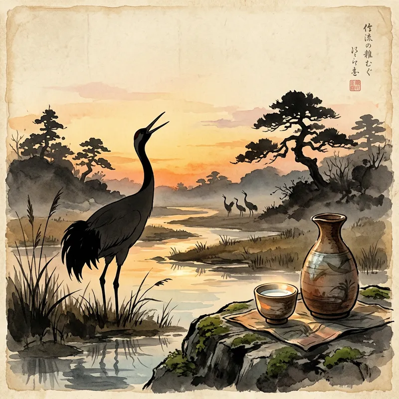 Visualize a serene scene under the silhouettes of nature. A calling crane, its figure outlined in the shadows of the peaceful evening. The gentle echoes of its voice are met with the harmonious chorus of its offspring responding from a distance. Near, a handsomely crafted wine vessel sits, brimming with delightful ambrosia, ready to be shared. Whether it's the soft glow of moonlight or the warm gleaming of a setting sun remains a mystery, let this be your choice to design. Create this tranquil scene as if it's from a beautiful haiku painting, with every element forming a part of a harmonious whole.