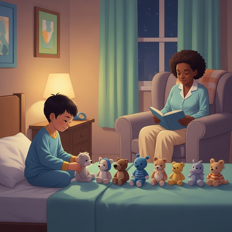 A picture that portrays a soothing and calming bedtime routine for a child with autism. Entailing the warm atmosphere of the room, dimmed lights, and the soothing colors around. The child, an Asian boy in his soft pajamas, is getting ready to sleep. He is seen engaged in repetitive activities like arranging his stuffed toys in a line, a known method used to calm children with autism. A parent, an African-American woman, is seen nearby, reading a soft-toned bedtime story in a peaceful environment.