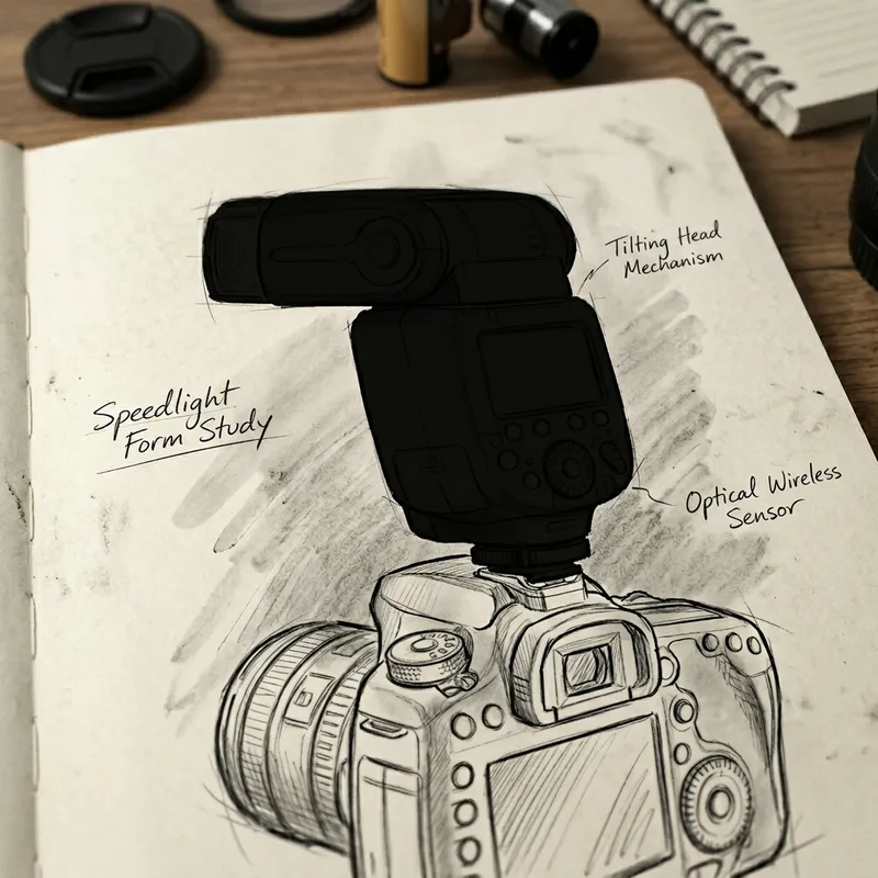 Monochrome sketch depicting the silhouette of a popular brand's camera flash