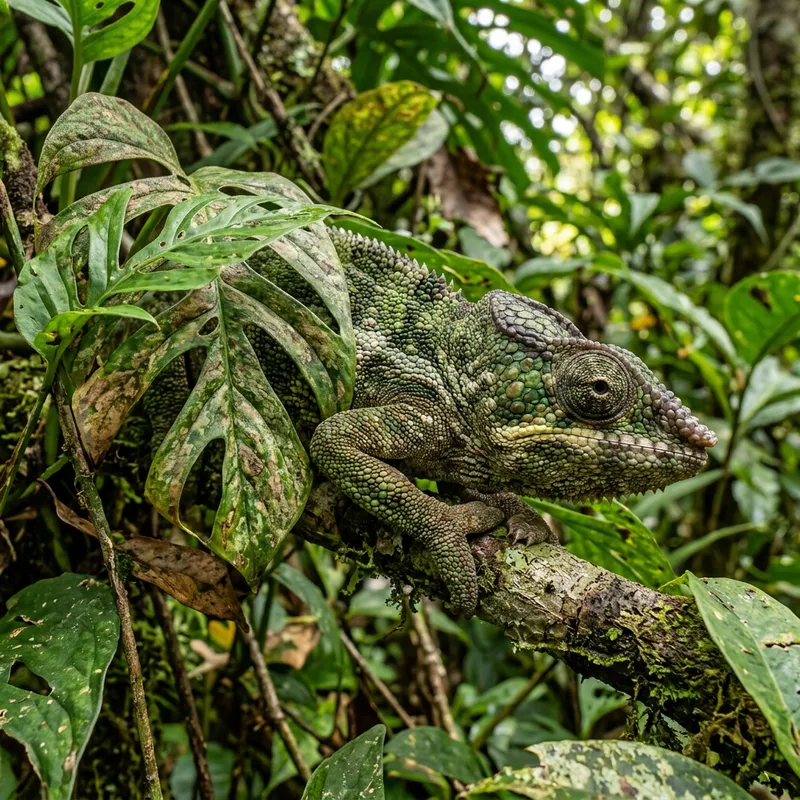 camouflage chameleon hidden among jungle leaves, green and brown tones, realistic texture, close-up of detailed scales