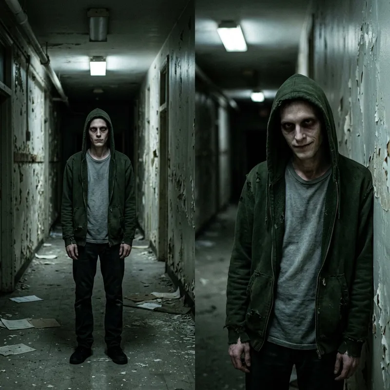 Can I get images of myself in different poses with specify the style ('realistic,' 'cinematic'), the subject ('figure with sunken eyes'), the mood ('ominous,' 'unsettling'), and the setting ('abandoned hallway'). Specify horror elements: explicitly include keywords like 'horror,' 'creepy,' 'sinister,' or 'nightmare'.