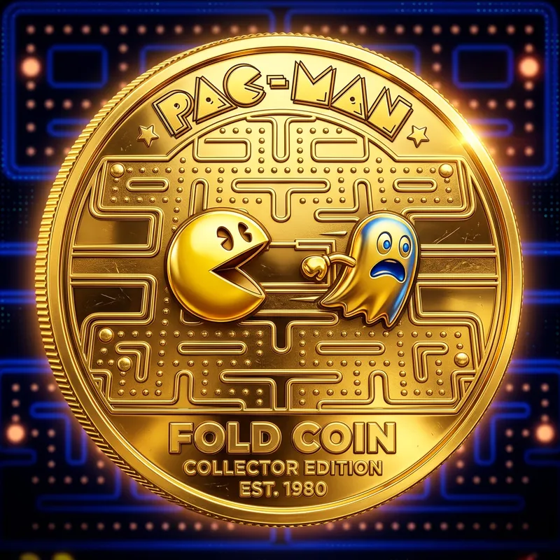 Can you create me an image of a fold coin with a Pac-Man figure about to eat a ghost figure? And the picture be shiny pfp like.