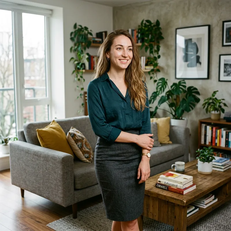 candid, documentary-style photograph of a woman in her late 20s standing in a stylish modern living room. She has long light brown hair and fair white skin with visible natural texture, pores, and faint imperfections such as subtle uneven tones or freckles. Her features are distinctive and realistic: high cheekbones, a long face, a narrow nose, a pointed chin, and large almond-shaped brown eyes. Her face shows gentle asymmetry and irregularities that make her unique and individual, not generic or model-like. She should look like a real person, not a fashion shoot subject. She is 5 feet tall with a believable, healthy figure: a 34D bust, a narrow waist, and full, rounded hips. Her build is proportional and realistic — natural curves, fuller hips and thighs, with healthy body weight and visible muscle tone. Her body should not look overly thin, stylized, or airbrushed. She is wearing a fitted pencil skirt and a silk blouse. The clothing has natural wrinkles, creases, and texture that drape realistically. Her posture is confident but natural, not posed. The room is a stylish but lived-in modern living space: a contemporary sofa, coffee table with scattered books or magazines, warm lighting from a window, and subtle design details like framed artwork or plants. The atmosphere is casual and authentic, as if captured in a real moment at home. The photo should be documentary in style — realistic lighting, no retouching, no glamour, no artificial smoothness.