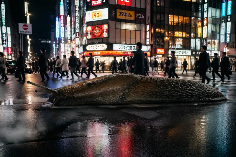 Candid street photography of a giant realistic slug the size of a car slowly crossing a busy Tokyo intersection at night, neon signs reflecting off its wet slimy skin, commuters walking around it unbothered, steam rising from manholes, shot on Sony A7III, 50mm lens, photorealistic, strange urban wildlife.