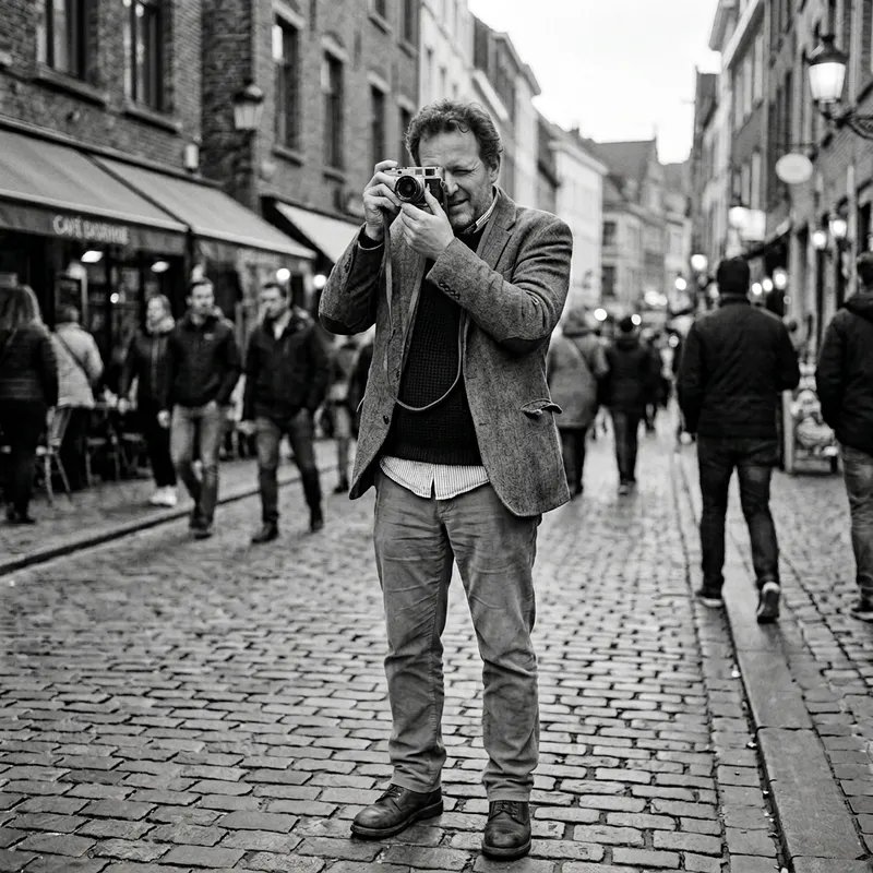 A Caucasian man in a casual attire, holding a vintage camera and absorbed in the process of capturing candid moments. The aroma of nostalgia emanates from his composition. The portrayal gives a feel of a black and white composition that evokes a timeless sense. He is using a camera that is similar in features to popular models, equipped with a 24mm lens, perfect for street photography.