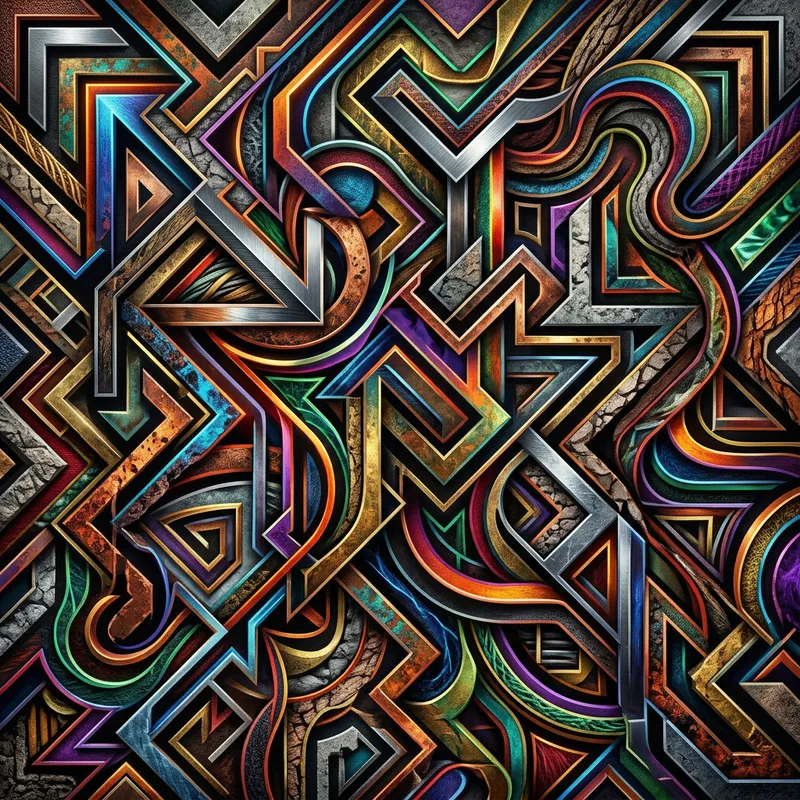 Create an abstract image that emphasizes on the concept of edges. Portray a variety of sharp and curved lines intersecting and overlapping in a way that they create an intricate and captivating pattern. Use a vibrant color palette to make the edges more prominent, playing with the balance of light and dark tones. The edges should form a complex maze, inviting the viewer to a journey that has no certain destination nor beginning. Each edge might take on a unique texture, adding more depth to the visual experience.