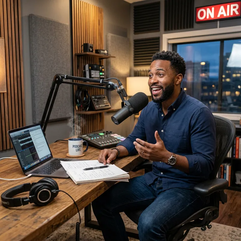Captivating African-American Podcaster in Modern Studio