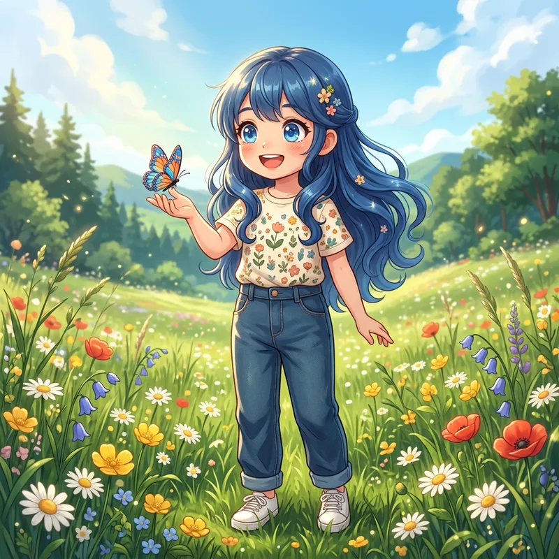 A captivating image of an anime-style girl. She has striking large eyes that sparkle with enthusiasm and innocence. Her long, wavy hair cascades over her shoulders and is a rich, vibrant shade of blue. She's dressed in an adorable, casual outfit consisting of a patterned t-shirt and a pair of comfy-looking jeans. She is standing in the midst of a blooming meadow with lush, verdant grass under her feet and a clear, blue sky overhead. The girl looks jubilantly at a bright, effervescent butterfly that had just landed gently on her outstretched hand.