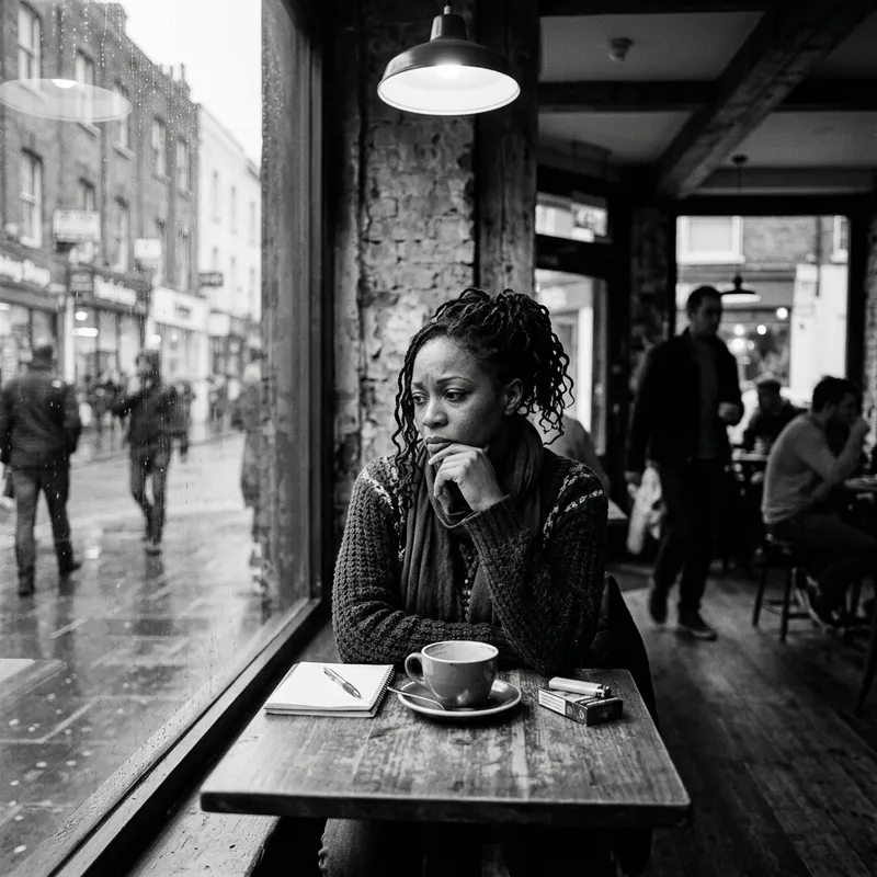 A black and white photo of a woman, who might be of any age or race, lost in deep thought. The style should be indicative of classic street photography--candid and spontaneous, yet full of profound stories. Capturing the contemplative expression on her face is a key element. The setting should emit a moody atmosphere, often seen in vintage 35mm film camera images taken through a wide-angle lens. The timelessness imparted by the monochrome effect should be felt.