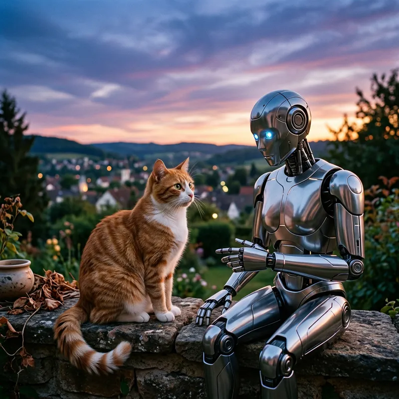 A captivating depiction of a standard domesticated feline, its short fur aglow in a blend of ginger and white patterns. It is seen sitting pompously with its tail curled around its body. Adjacent to it, is a humanoid robot, an android, crafted with a sleek reflective titanium alloy. Its eyes are glowing blue and it has manipulators for hands. The two entities share a serene moment of mutual curiosity under a sky brushed with hues of twilight.