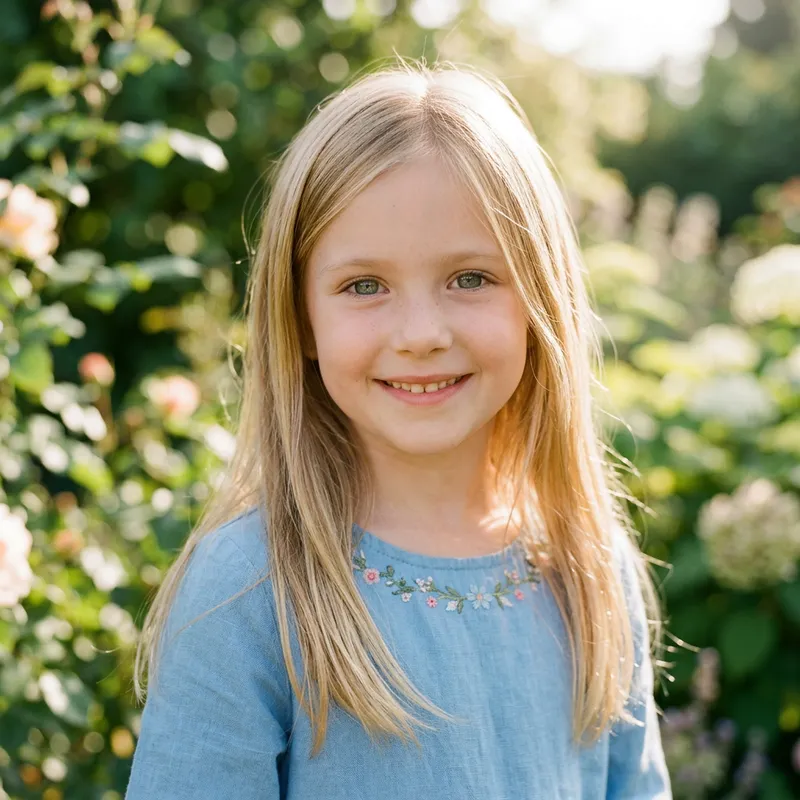 A portrait of a young girl who has pale, Caucasian skin. She has captivating grey eyes that glisten under the sunlight. Her hair is straight and blonde, and it cascades down her shoulders, complimenting her fair complexion and accentuating her beautiful features.