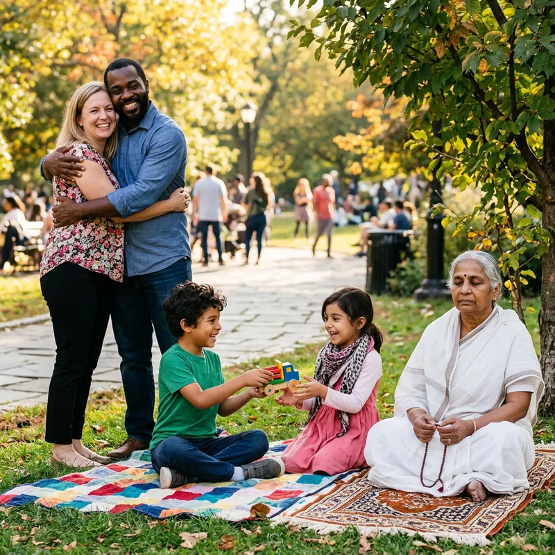Create a captivating image of a diverse scene symbolizing three key themes: love, giving, and prayer. Include a Caucasian woman and a Black man engaged in a loving embrace, exchanging smiles full of kindness and affection. Nearby, illustrate a Hispanic boy generously giving a toy to a Middle-Eastern girl, their faces glowing with joy and sincerity. Finally, portray a South-Asian elder gracefully seated, eyes closed in prayer, radiating a sense of serenity and spiritual depth. The image should captivate the viewer's attention and spark conversation, filled with vibrant colors, gentle lighting, and heartfelt emotion.