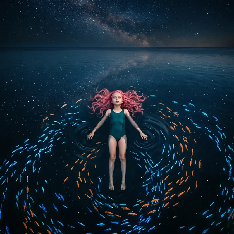 An overhead full shot in cinematic color tones captures a young girl with striking golden eyes and roseate hair peacefully floating face up in the middle of a calm, undisturbed sea. The tranquil water surface mirrors the twinkling stars from the inky night sky overhead. Blue and orange fish, symbols of life beneath the surface, weave their way around her in a graceful aquatic dance.