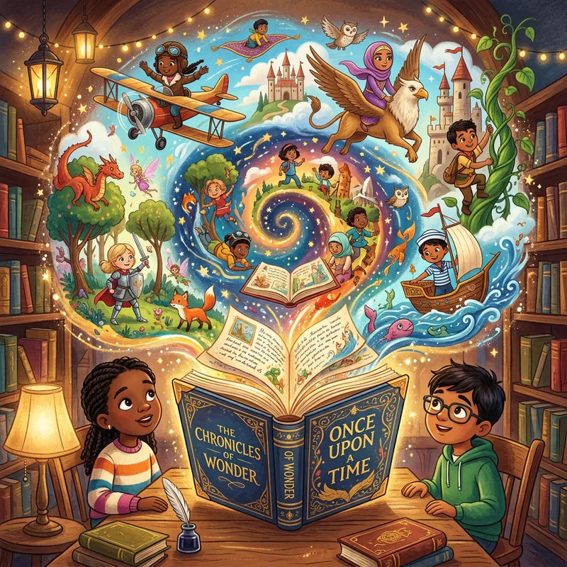 A captivating scene that captures the magic of storytelling through a collection of whimsical illustrations. In the scene, there's an open storybook surrounded by vivid, colorful images bursting from its pages, each telling a different story. Characters from a diverse range of ethnic backgrounds including Middle-Eastern, Caucasian, Black, Hispanic, and South Asian are brought to life in the illustrations. There could be scenes of adventures, mysteries, fairy tales, and more, all intermingling and interacting in a fantastical whirlwind of narratives. The style is imaginative, dream-like, and child-friendly.