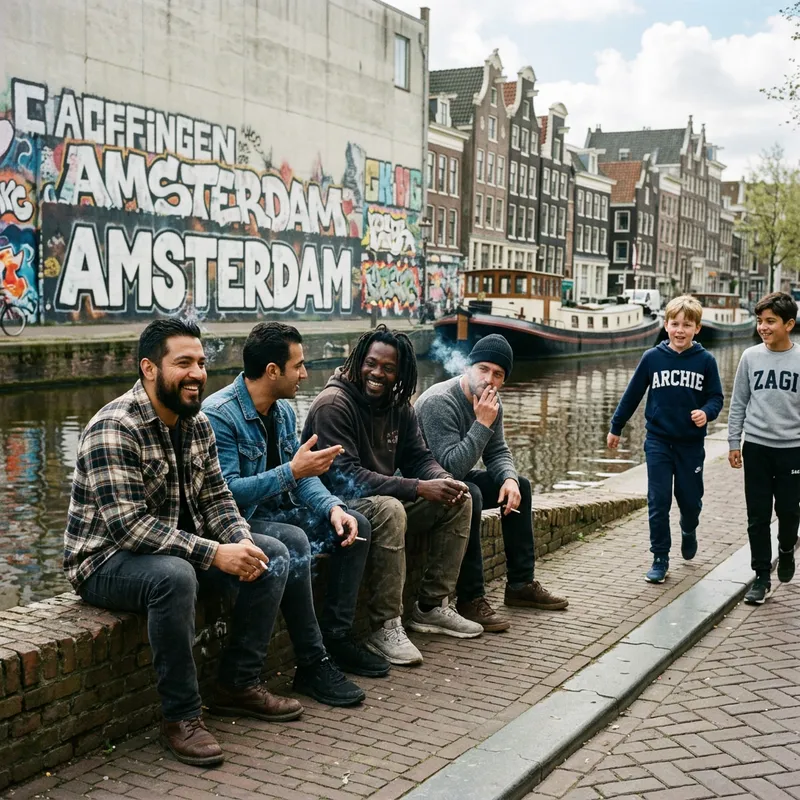 Four men of differing descents: a Hispanic man, a Middle-Eastern man, a Black man, and a Caucasian man, all casually dressed, are sitting by a waterfront in Amsterdam. Each man holds a cigarette, with traces of smoke gently rising around them, captured in a candid documentary-style representation. They are absorbed in a conversation, exuding a sense of camaraderie. The background is marked by a graffiti-covered wall that prominently showcases 'Amsterdam'. On the side, two boys, each sporting sweatshirts with the names 'Archie' and 'Zagi' respectively, pass by, injecting youthful exuberance into the scene. The image is conveyed as if taken by a vintage 35mm film camera for a nostalgic feel. The composition follows the principles of minimalism, everyday life focus, and the decisive moment, reminiscent of the era of Henri Cartier-Bresson. The scene portrays the urban charm and cultural richness characteristic of Amsterdam.