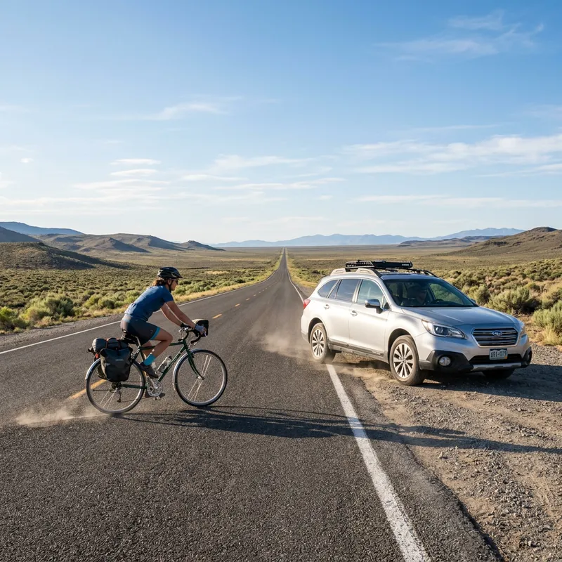 A car and a bicycle on a road leading towards the horizon. The road is straight and seemingly endless, punctuated only by the occasional stray cloud in the sky. As we look out into the distance, there's an undeniable sense of wonder and adventure. The car and bicycle are in pristine condition - the car's metallic paint shines brightly under the sun and the bicycle's spokes glisten. The car's wheels roll smoothly over the upturned gravel and the softly spinning bicycle wheels stir up a small dust trail in their wake. The surrounding landscape is serene, painting a perfect picture of lonesome travel.