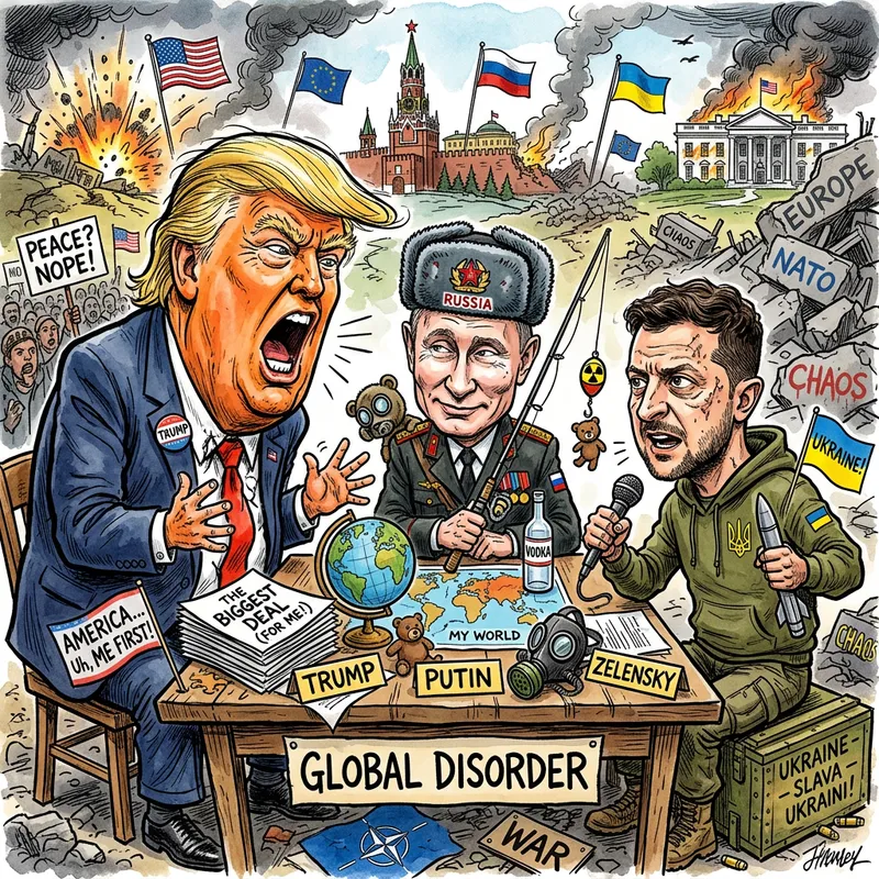 Humorous Caricature of Donald Trump, Vladimir Putin, and Volodymyr Zelensky