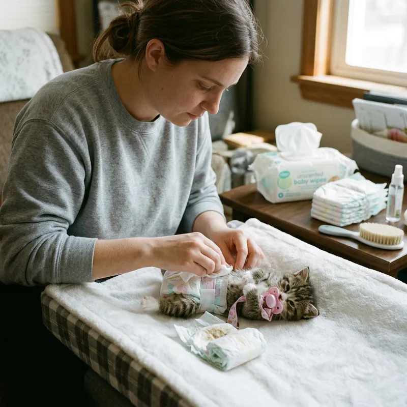 A newly born tiny kitten wearing a diaper and a pacifier, the kitten is also defacating in the diaper. Also depict an individual with a neutral characterization, taking care of the kitten by changing its diaper.