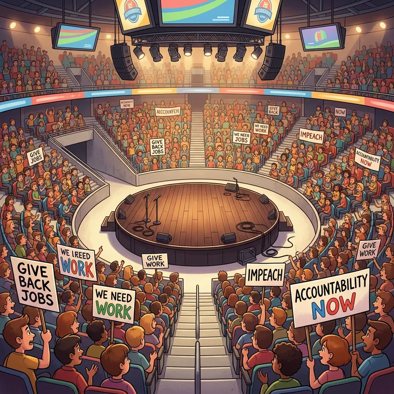 Cartoon AI of an arena filled with an audience of people is seated around the stage. The people in the audience are holding protest signs that say, give back jobs and Impeach. In the middle of the arena the stage is empty.