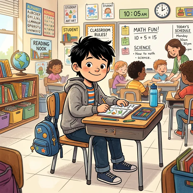 Cartoon Drawing of 8-Year-Old Boy in Classroom