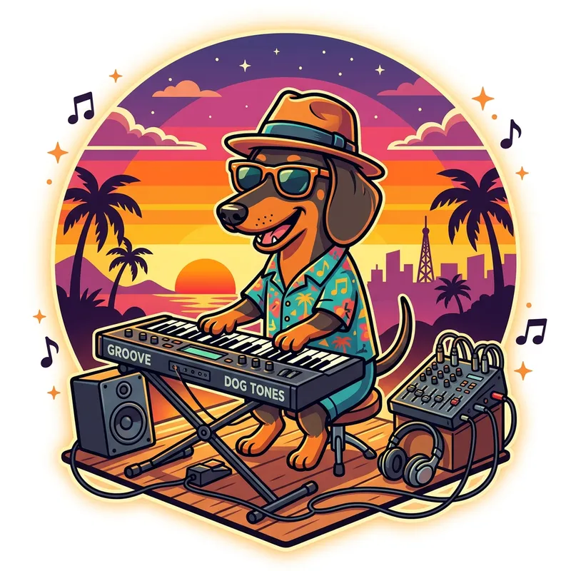 Generate a vector graphic image featuring a cartoon character, a dachshund musician. This cool canine sports sunglasses, a fedora, and a shirt. He is engrossed in playing a keyboard that is connected to a soundboard. The backdrop is an evocative depiction of a vintage sunset. The art is composed with bold outlines and vibrant colors, providing a smooth and clean texture. This captivating design is suitable for T-shirt printing.