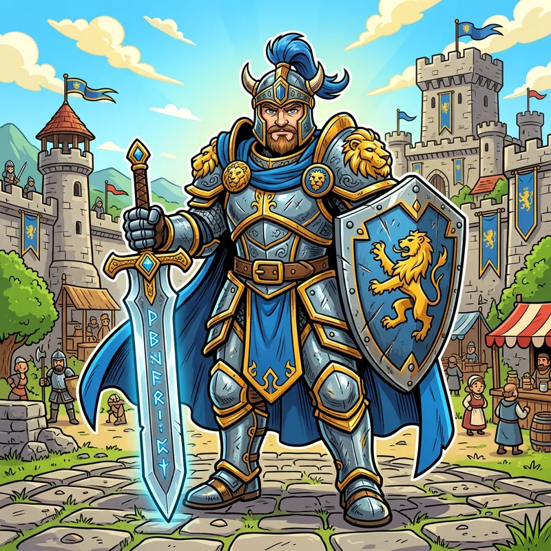cartoon fantasy hero portrait, kingdom rush style, bright colors, detailed shading, outlined, medieval armor, game character illustration