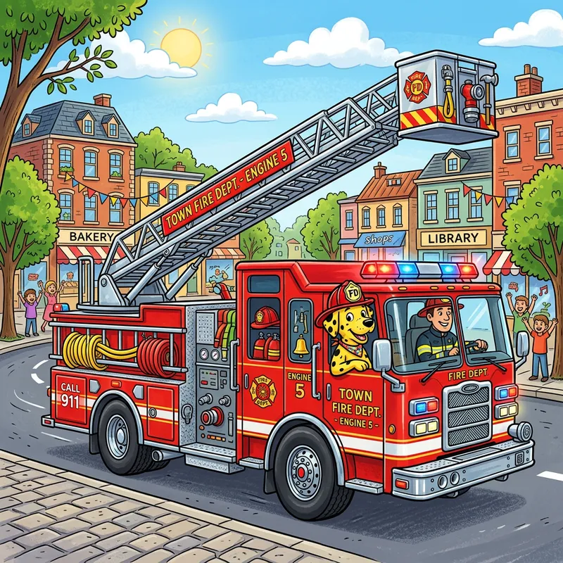 Illustrate a cartoon-style fire engine. Use vivid, primary colors. The fire engine should be predominantly red, with an extended, shiny ladder, and polished wheels. Also add details like flashing lights, fire hoses, and firefighter helmets inside the vehicle. To make the drawing more vivid, include a friendly yellow dalmatian, wearing a firefighter hat, sitting in the passenger seat. The scene is set on a sunny day in a small, cartoon-style town with a few multi-story buildings visible in the background.