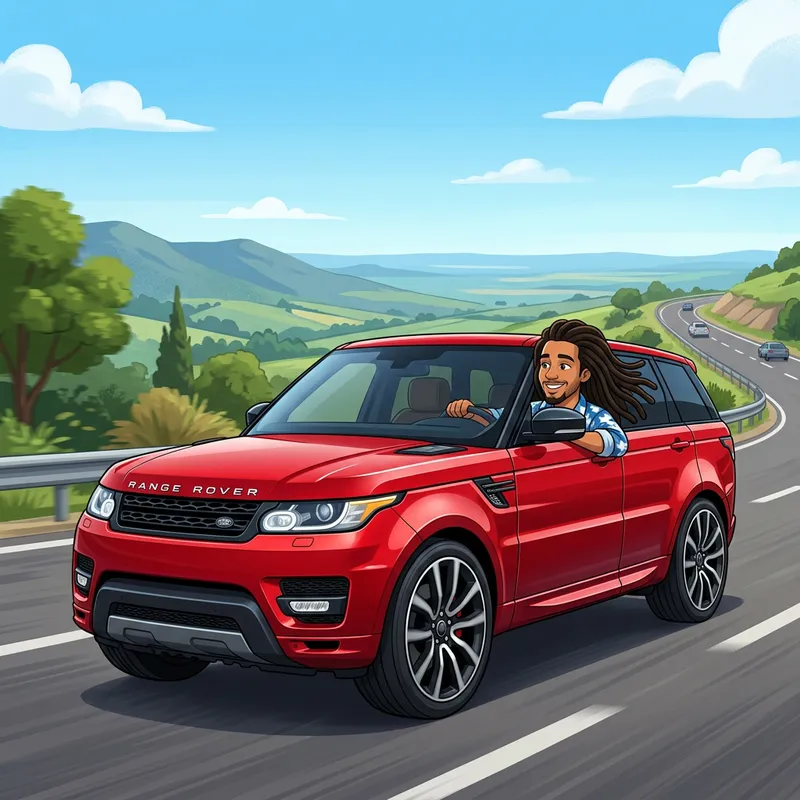 A light-skinned cartoon character with long dreadlocks driving a red Range Rover Sport. The guy is seen from the side view with a pleasant smile on his face. The Range Rover sport is strikingly red with shiny metallic finishing, large alloy wheels, and dark-tinted windows. The background is an open road with clear blue skies above.