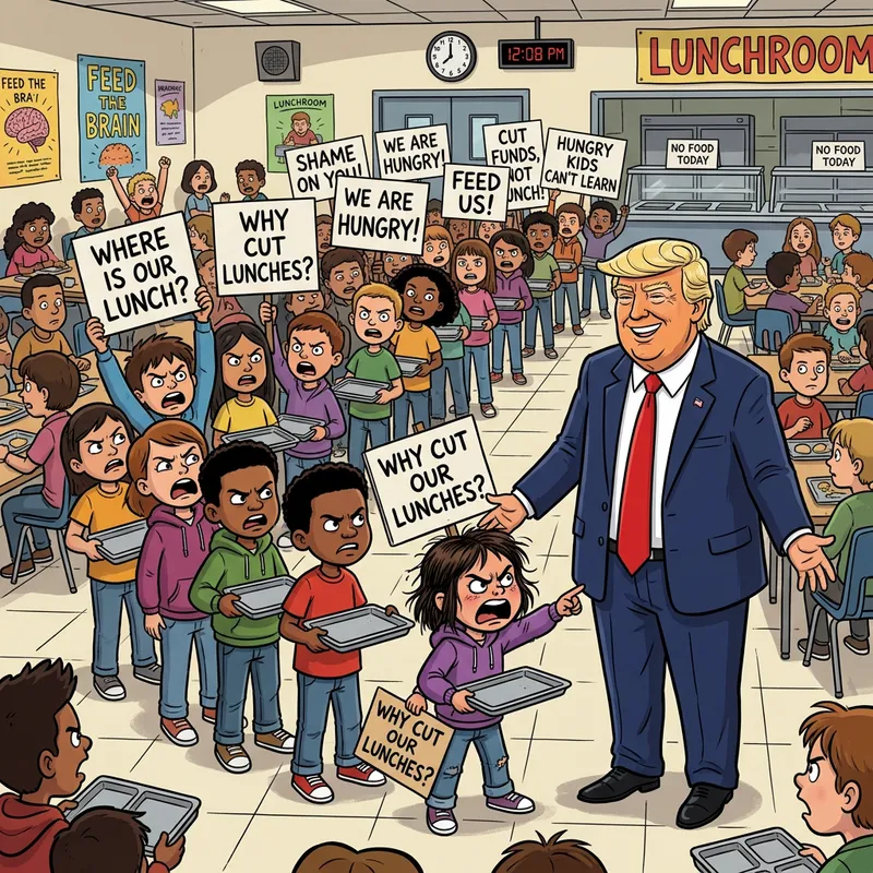 Cartoon image of angry kids in a lunchroom lined up with empty food trays in their hand looking upset. Trump stands there next to a girl who has her hand out at him with an angry face looking at trump, he stands there in a dark blue suit with a red tie looking down at the girl with a smile on his face. Some kids are in line together and are all holding up paper that say, Where is our lunch, why cut lunches, shame on you. They all are wearing regular clothing.