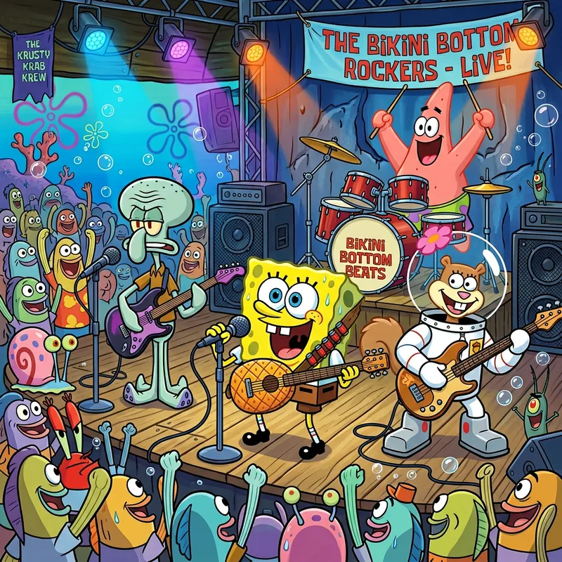 Cartoon image of Spongebob Squarepants as a lead singer and guitarist, Squidward Tentacles as the backup vocals and guitar, Sandy Cheeks as the bassist, and Patrick Star on the drums.