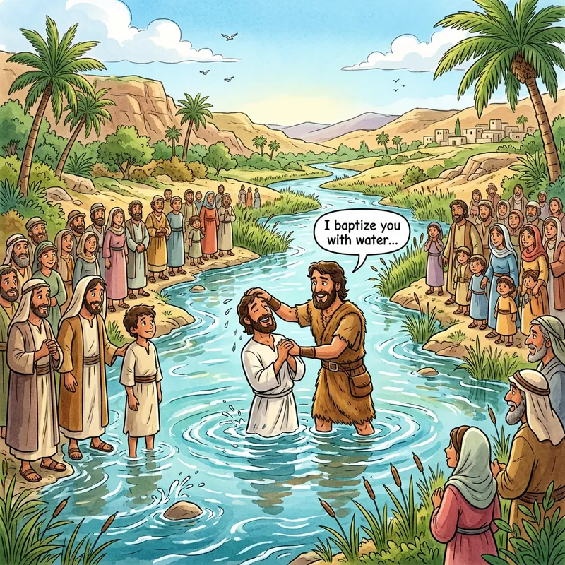 Cartoon, John the Baptist baptizing people in the Jordan river