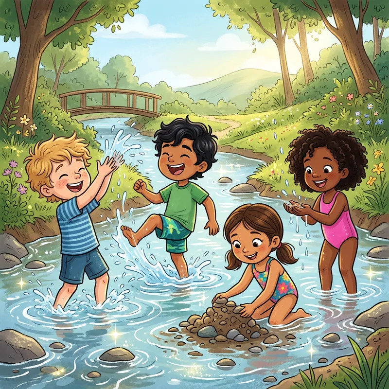 An illustration of cartoon children merrily playing in a gentle stream. The scene captures two boys and two girls of different descents. One boy is Caucasian with blond hair, animatedly splashing water with his hands. The other boy is South Asian with black hair, laughing as he kicks water in the air. The first girl, who is Hispanic, with brown hair, is carefully building a small dam with pebbles. The second girl, who is Black with cute curls, is gleefully catching water drops in her hands. Their faces express pure joy, and the water shines under the summer sun.