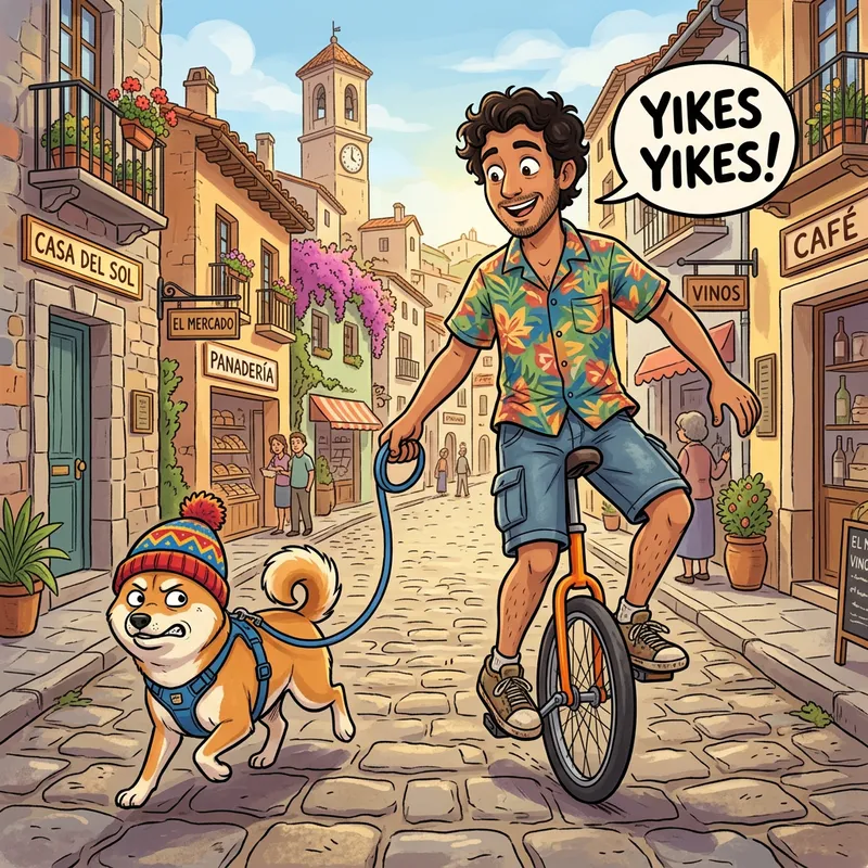 Generate an image of a laid-back cartoon man of Hispanic descent, balancing on a unicycle as he navigates the cobblestones of a quaint village. By his side, a leash connects him to his shiba inu dog, who has a comically peculiar expression. The dog is sporting a knitted woolen hat. The word 'YIKES YIKES' appears as a voice bubble coming from the man's mouth, conveying his surprise or delight.