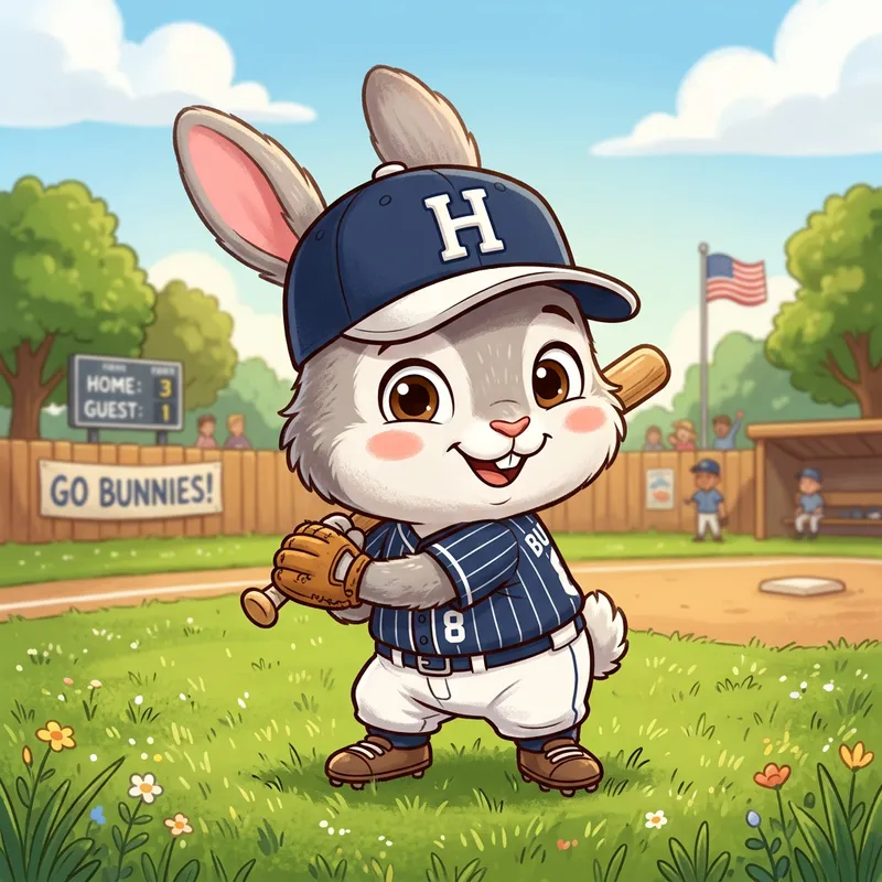 Cartoon picture of a bunny rabbit with a baseball cap that has the letter H on it.
