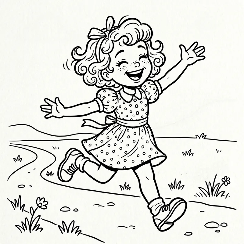 A coloring page featuring a line drawing of a girl with short, curly hair. The image should be in a cartoon-like style reminiscent of animated films from the early 20th century. The girl is happy and active with playful expressions. The background is simple and plain, focusing all attention on her unique characteristics and style.
