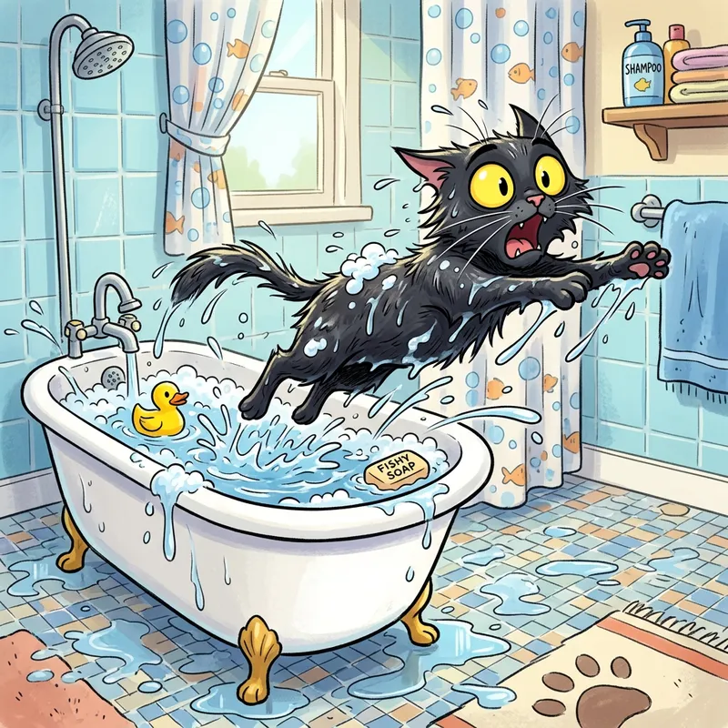 Cartoon Wet Black Cat Jumping Out of Bathtub