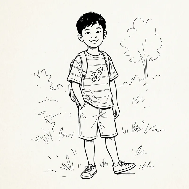 Charming Line Drawing of an 8-Year-Old Asian Boy