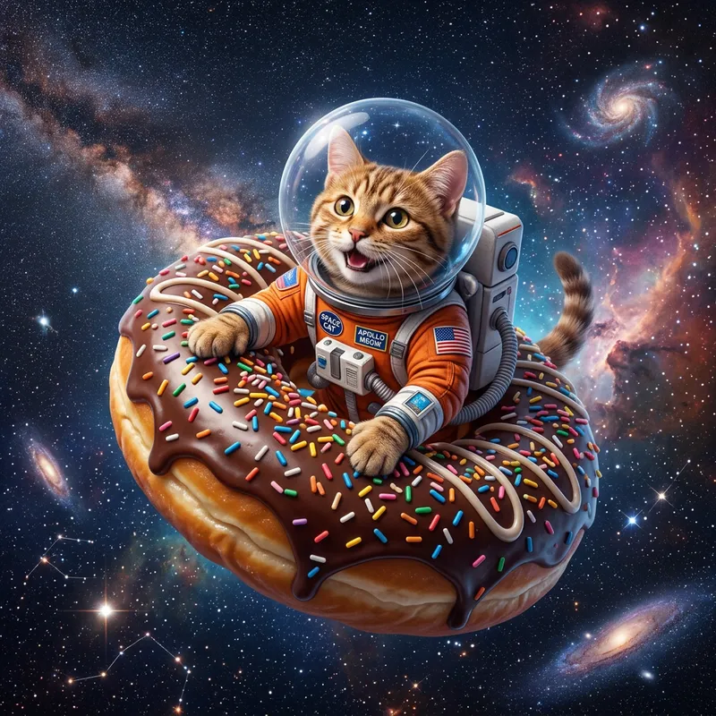 A cat astronaut floating in space on a doughnut. The astronaut suit is fitting for a cat, equipped with a glass helmet that allows for the visibility of the cat's facial features. The cat looks ready and excited for the journey. Its paws are closely nestled on the gigantic doughnut, which is beautifully glazed and sprinkles on top, twisting on its axis as it drifts through the space. Background is filled with astonishing views of stars, constellations and distant galaxies, with patches of vibrant cosmic dust adding color to the scene.