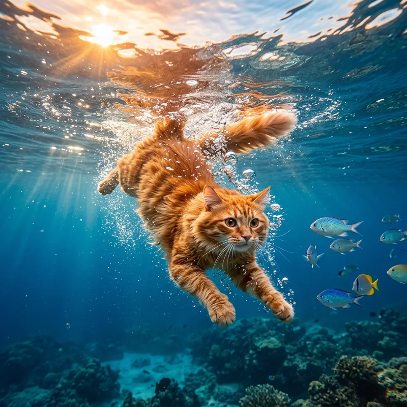 A fluffy orange cat bravely diving into deep, crystal clear blue water. The cat appears to be enjoying. Its eyes are open wide as if thrilled. The bubbles around the cat highlight the depth of its dive. The water surface above is sparkling, reflecting the rays of the setting sun, while the water depth manifests a darker shade of blue. Some fishes can be noticed swimming nearby, observing the cat with curiosity.