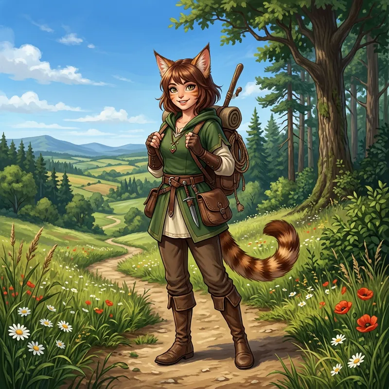 A fantasy character representing a fusion of a cat and a girl. The characteristics should blend seamlessly with the feline grace and agility of a domestic cat while retaining the humanoid features of a young female. Imagine her with pointy, furry ears on top of her head, and a tail swinging playfully. Her eyes sparkle with an enigmatic charm similar to a cat's mesmerizing gaze. She is dressed in modest adventure gear, ready to embark on her mystical quests. The background should be a charming countryside scenery, with rolling hills and tall, whispering trees reaching towards a spacious, sapphire sky.