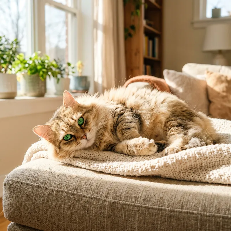 Fluffy Green-Eyed Domestic Cat Lounging on Sunlit Couch