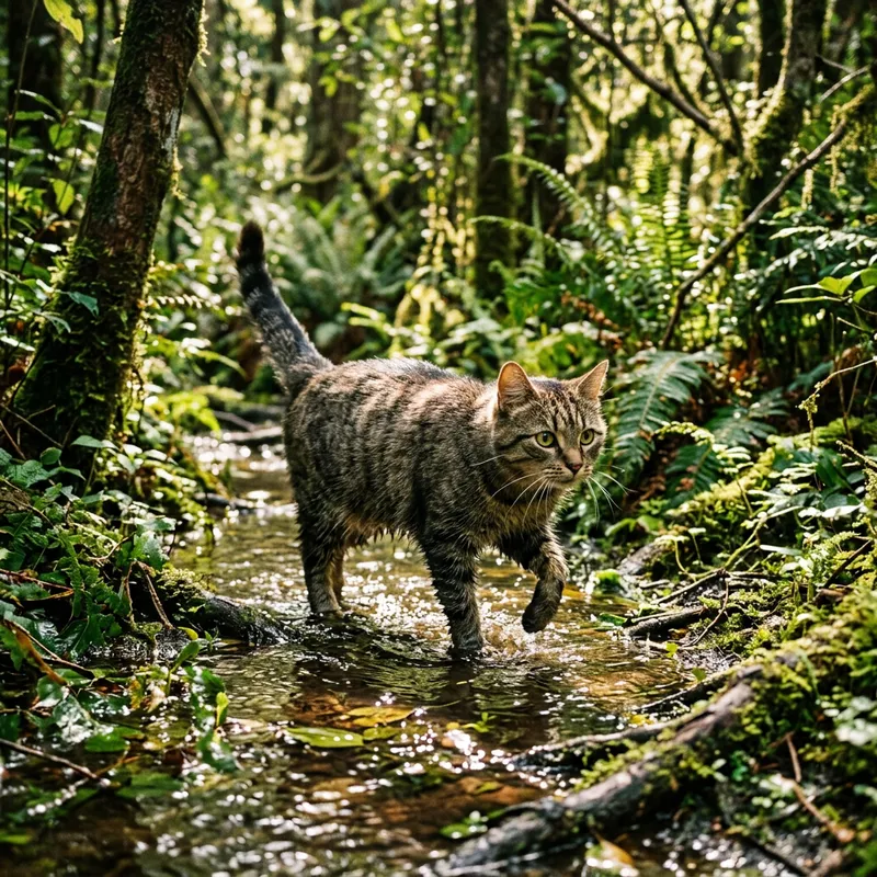 A cat navigating through a watery forest, its fur a mix of both dry and damp, reflecting its recent encounters with the water. Sunlight filters through the dense foliage, highlighting the various shades of green around. Puddles of water shimmer under the sun's rays. The cat's eyes, shimmering with resolution and curiosity, perfectly capture the wild yet serene environment.