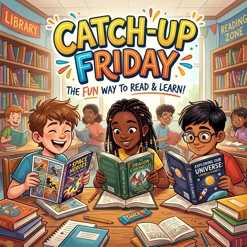 Create a lively and fun cover picture illustrating a diverse group of young students who are engrossed in various books. One student, a fair-skinned boy is reading a comic book with a grin, while a black-skinned girl is engrossed in a fantasy novel. A South Asian boy is immersed in a science book. In the background, numerous books are scattered, adding to the academic environment. At the top of the image, ensure the inclusion of vibrant texts that reads, 'Catch-up Friday', further evoking a sense of edutainment.