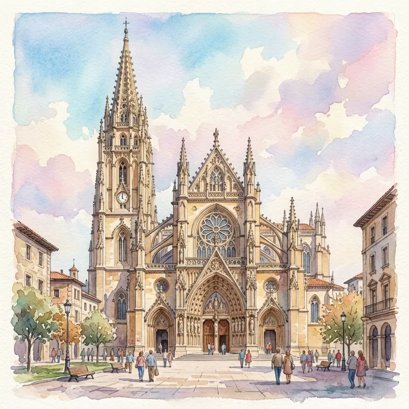 An artistic rendering of La Catedral de San Salvador, also known as Oviedo Cathedral, in watercolor. The image captures the grandeur of the gothic architecture with its intricate details, the high spires reaching towards the sky, and the beautiful arches and windows. The perspective is such that one can see the front facade of the cathedral in full glory, with the magnificent entrance door, set against soft, pastel skies. The application of the watercolor palette lends the image both a surreal and nostalgic charm.
