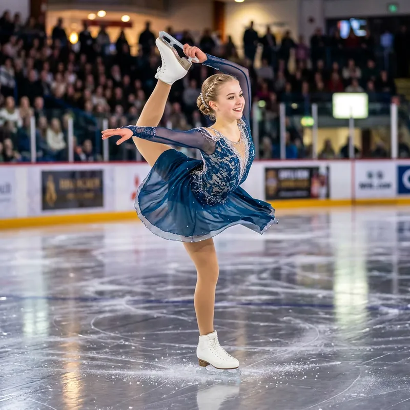 A 17-year-old Caucasian girl with blonde hair and green eyes. She is kind-hearted and a passionate ice skater, showcasing her skills on a glistening icy ground. She's elegantly dressed in a figure-skating outfit, radiating warmth and dedication for her craft.
